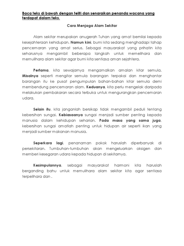 75 menganggap dokumen ini bermanfaat Tandai dokumen ini sebagai bermanfaat. Bumi yang luas dijadikan tempat tinggal manusia. Pelbagai cara dapat kita lakukan untuk menjaga kebersihan alam sekitar.